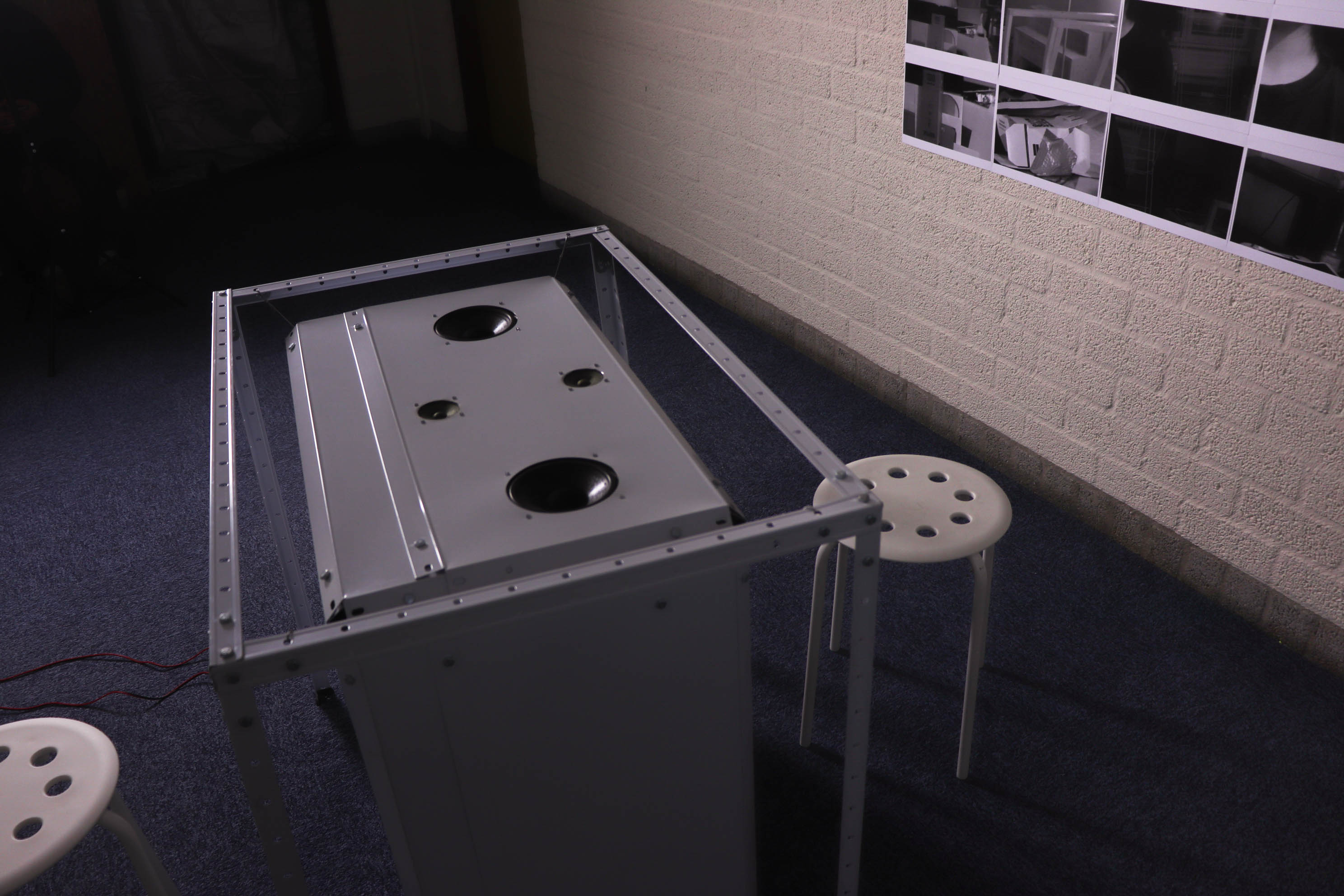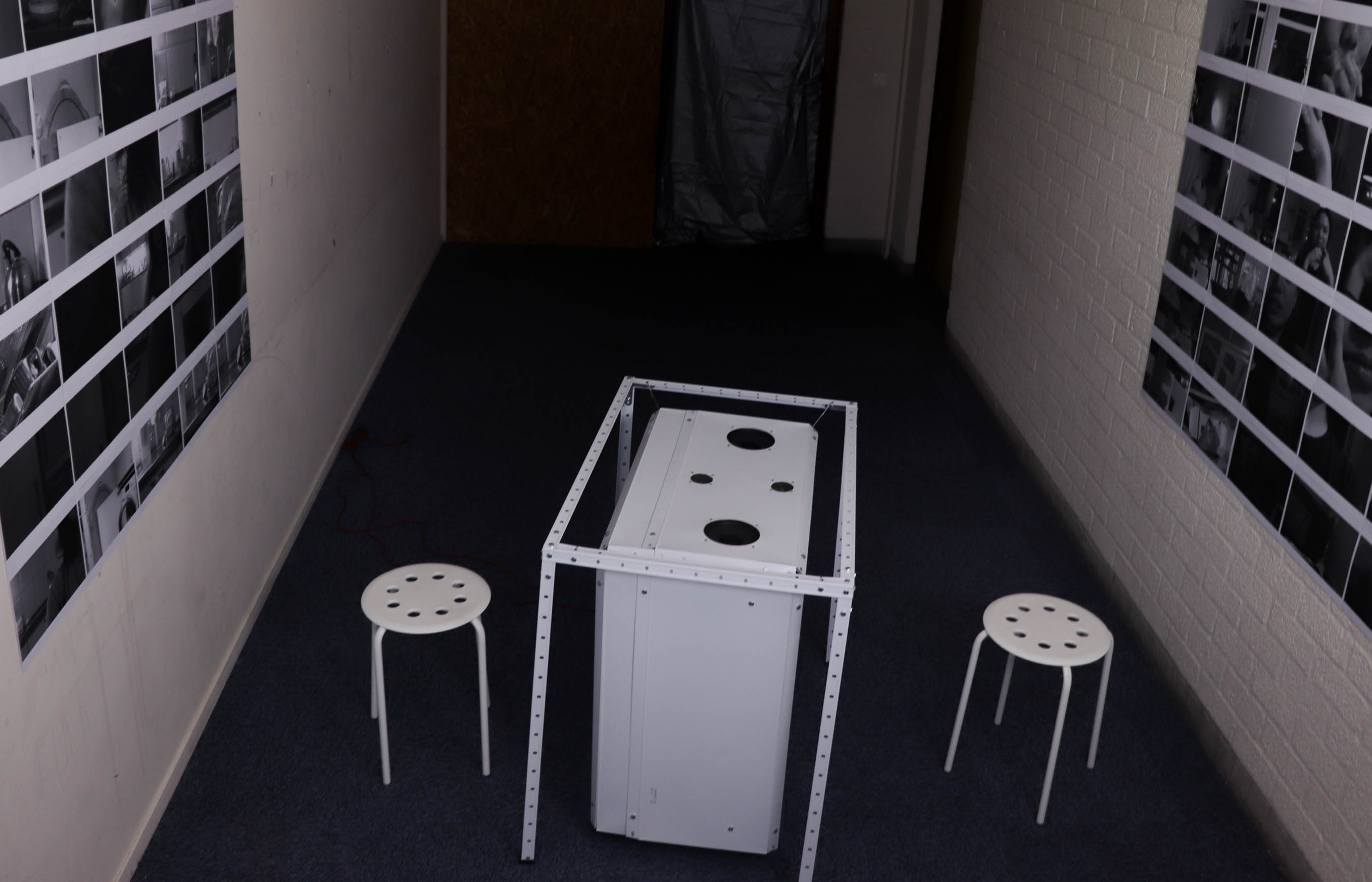 Photographs in the project are a tool to create memory or replace it rather than a tool of remembering. The sets of images printed on A4 assembled on two walls compose the scenes of two dwellers facing. The speaker, made from a ready-to-build metal shelf - usually standing dangerously in temporary or contemporary houses- replaces the volume of a wooden dining table the dwellers sat around and plays the sound of guessing. Audiences sit across at the metal speaker and shift their glimpses along the game.